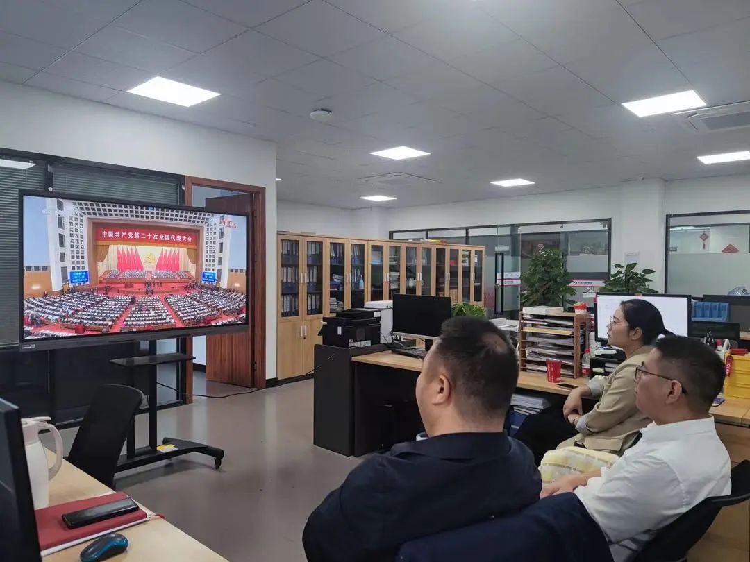 2022年10月16日上午10时,中国共产党第二十次全国代表大会在人民大会堂开幕。金年会控股集团党委通过“线上+线下”的方式组织全体党员第一时间收听收看党的二十大开幕会盛况,学习习总书记重要讲话精神。